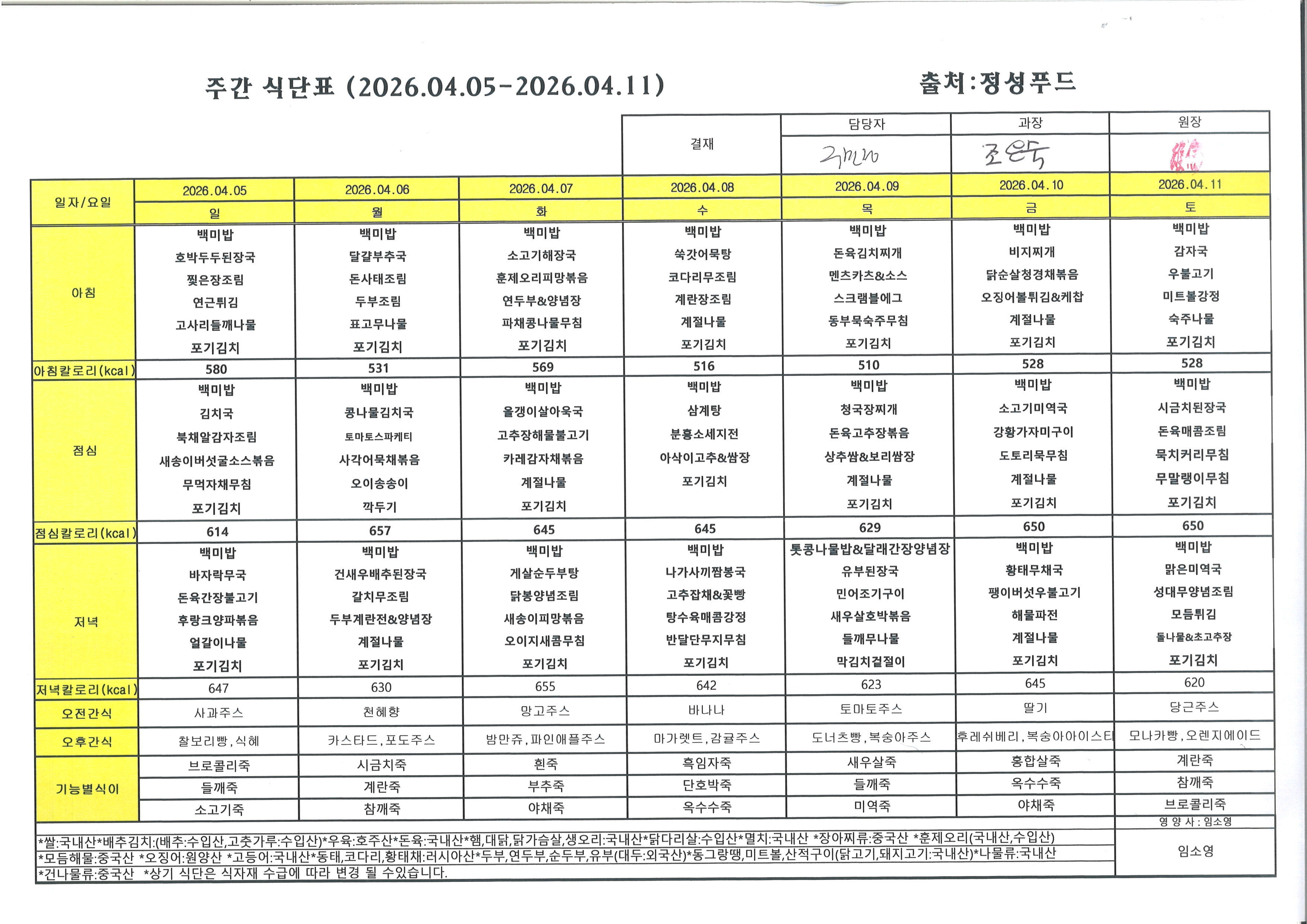 4월 둘째주 식단표