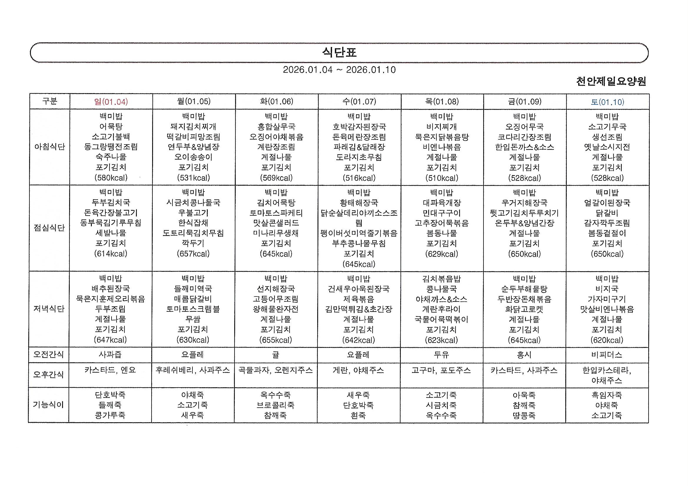 1월 첫째주 식단표